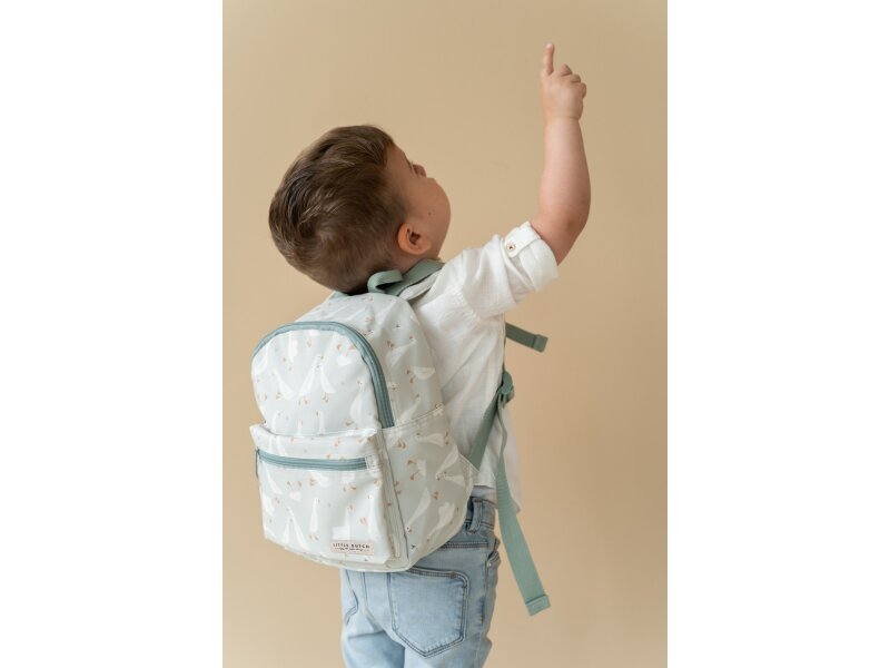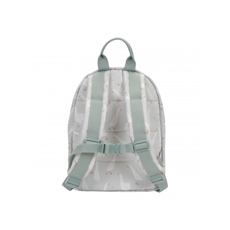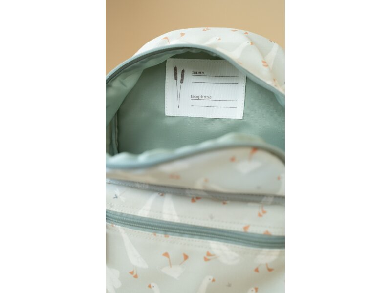 Rozkošný detský batôžtek potlačený obrázkami húsky je ideálnym doplnkom na výlety do prírody i prechádzky mestom. Batôžtek má nastaviteľné ramenné popruhy a hrudný pás na príjemné nosenie. Držadlo umožňuje prenášanie v ruke. Batôžtek je vybavený vonkajším vreckom na zips na uloženie drobností a vnútorný priestor s vreckom, elastickým držiakom na pitie a menovkou.