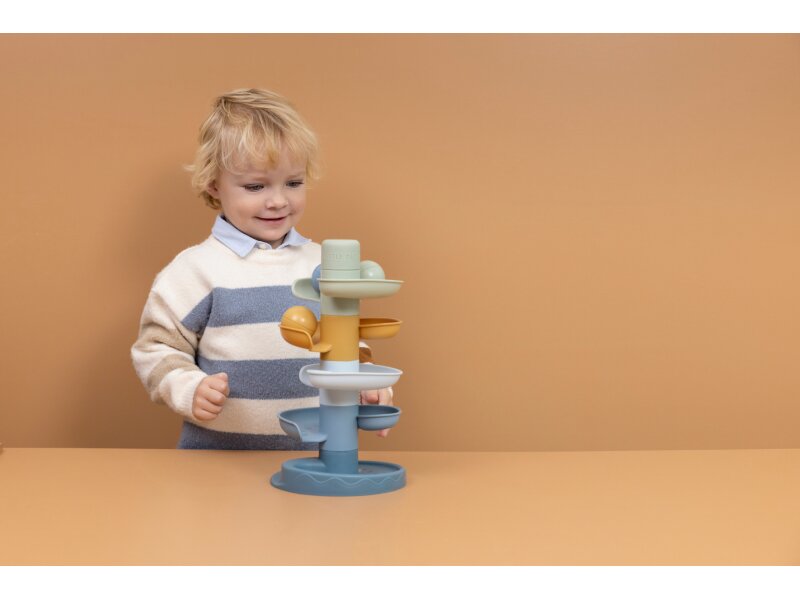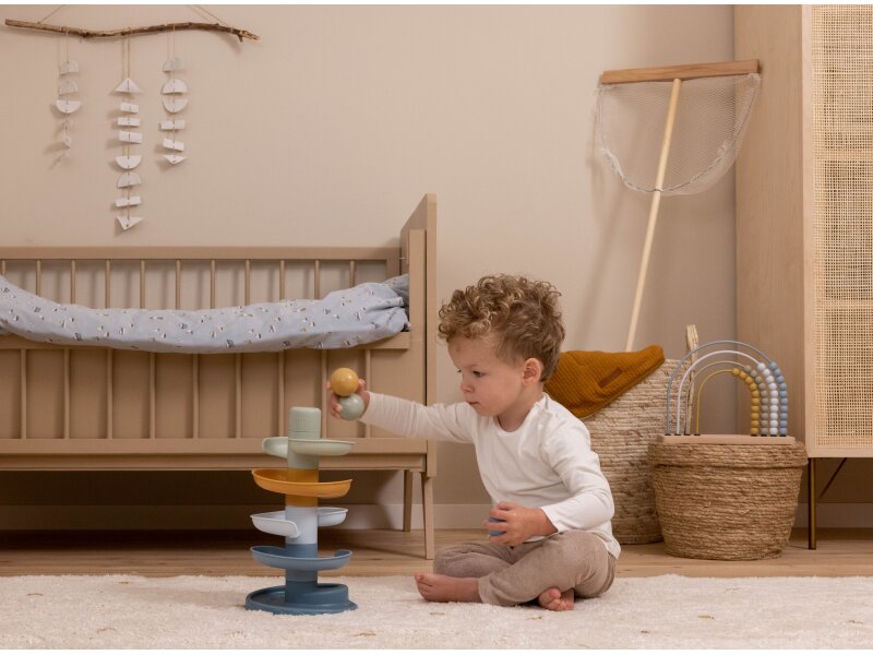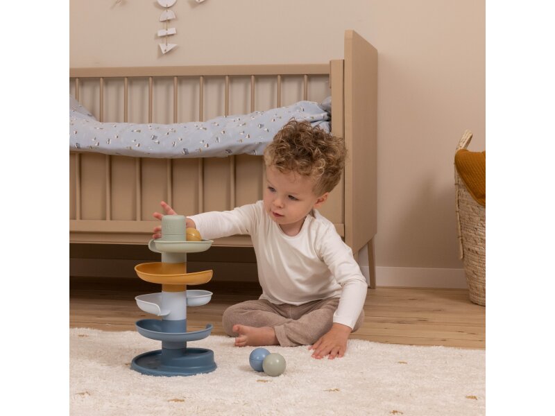 Sledujte s vašim dieťaťom, ako sa loptičky kotúľajú dookola jedna za druhou! Dráhu v jemných pastelových farbách ľahko zostavíte z piatich dielov a zábava môže začať.
