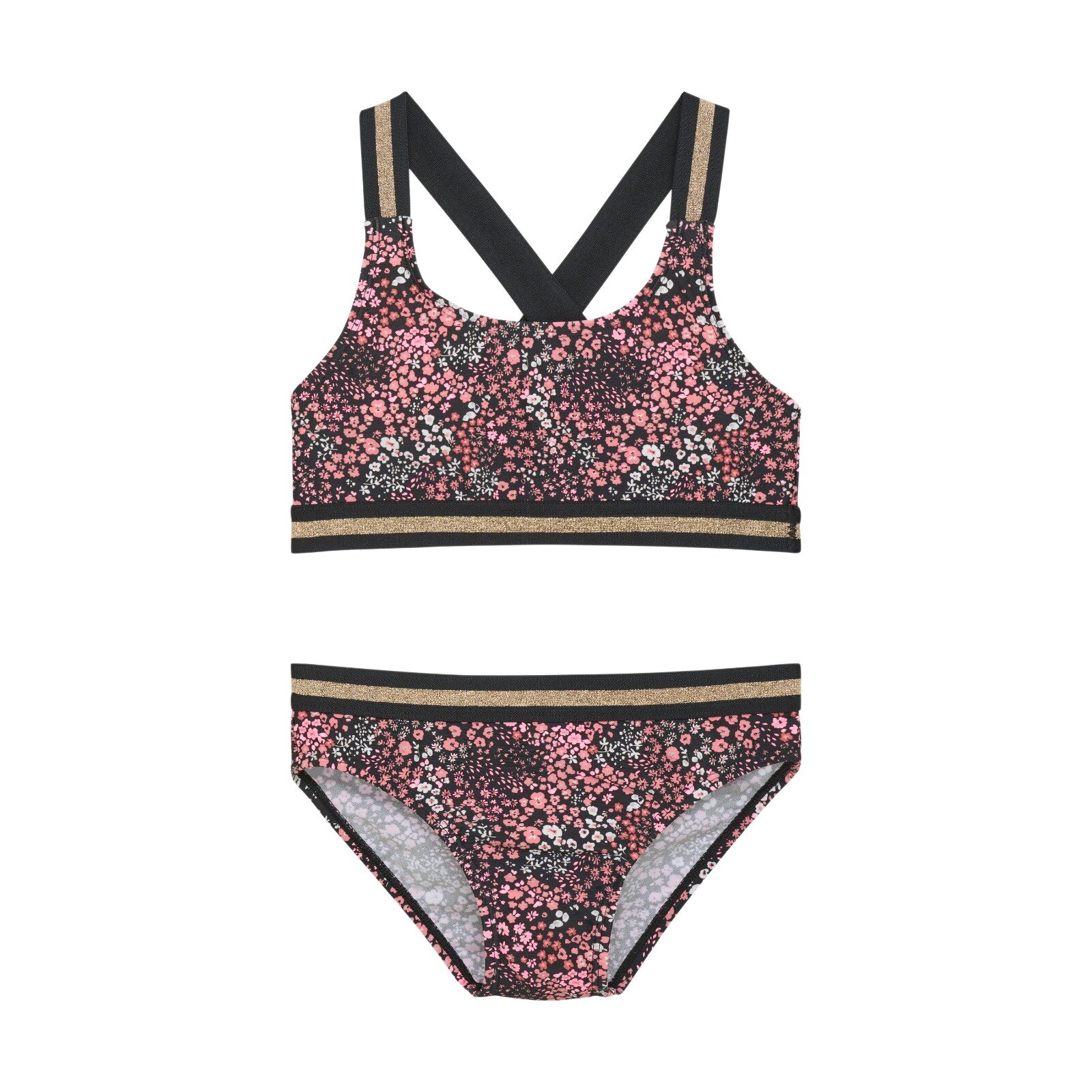Krásne bikiny od Color Kids. Top bikín má široké, dvojfarebné ramienka, ktoré sú vzadu prekrížené, aby nepadali. Bikinové nohavičky majú polovysoký pás s dvojfarebným lemovaním. Vyrobené z rýchloschnúcej látky s dostatkom streču.