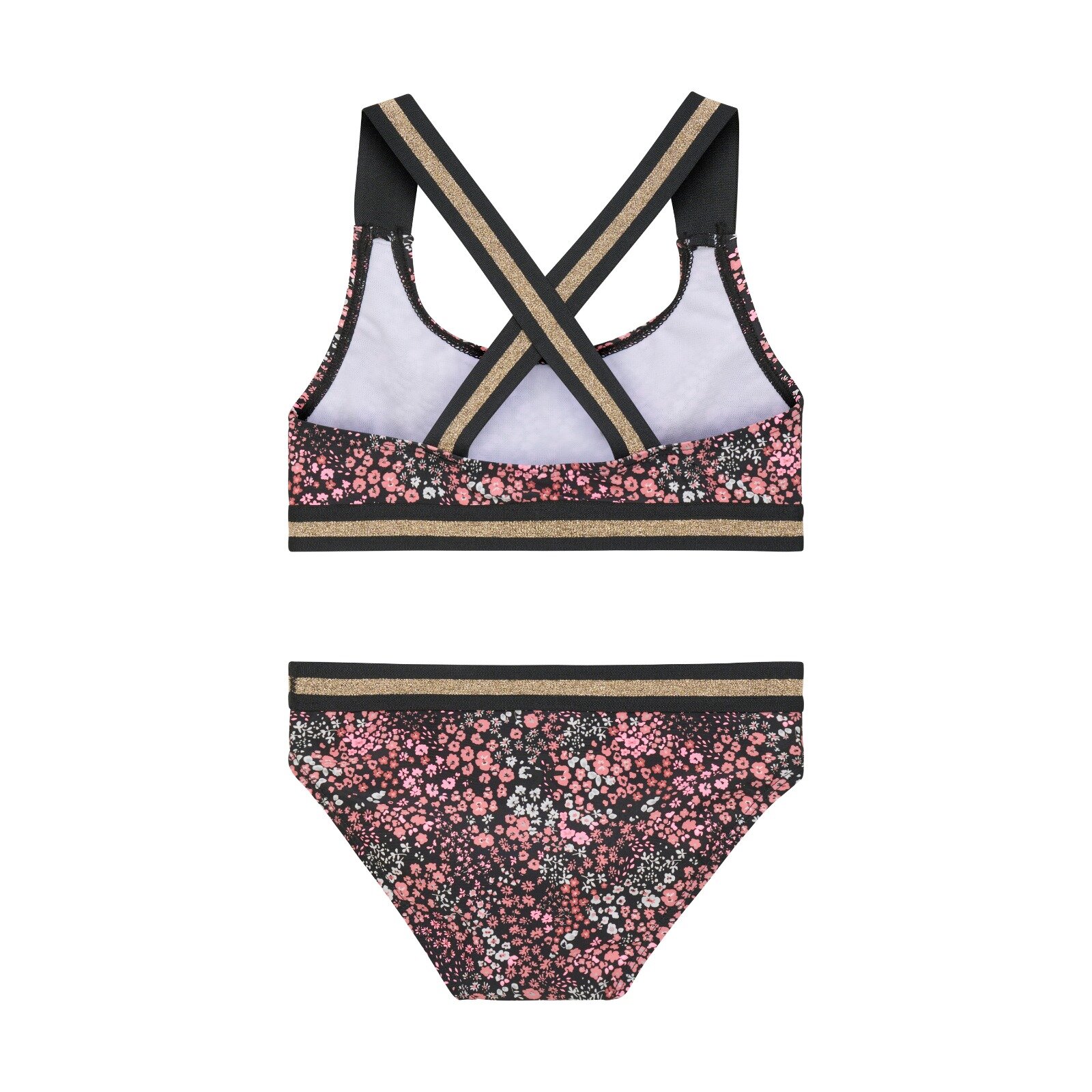 Plavky majú celoplošnú kvetinovú potlač. Ramenné popruhy sú na chrbte prekrížené, aby nepadali.