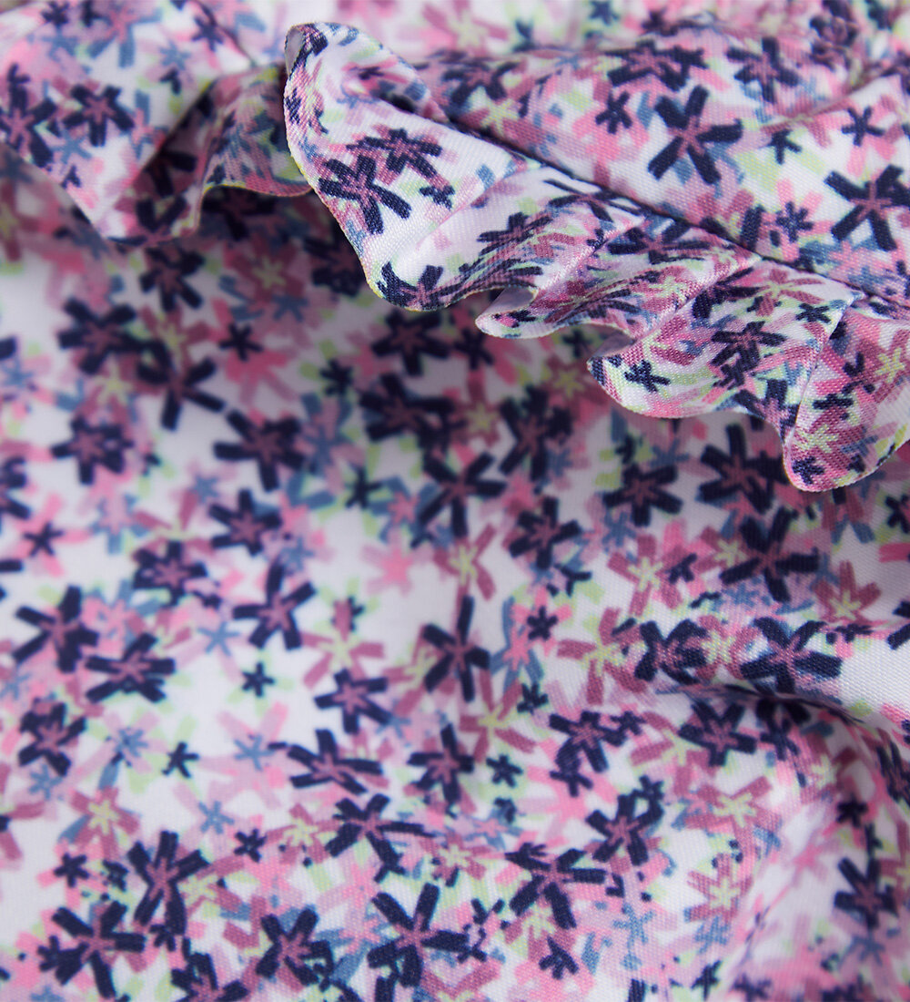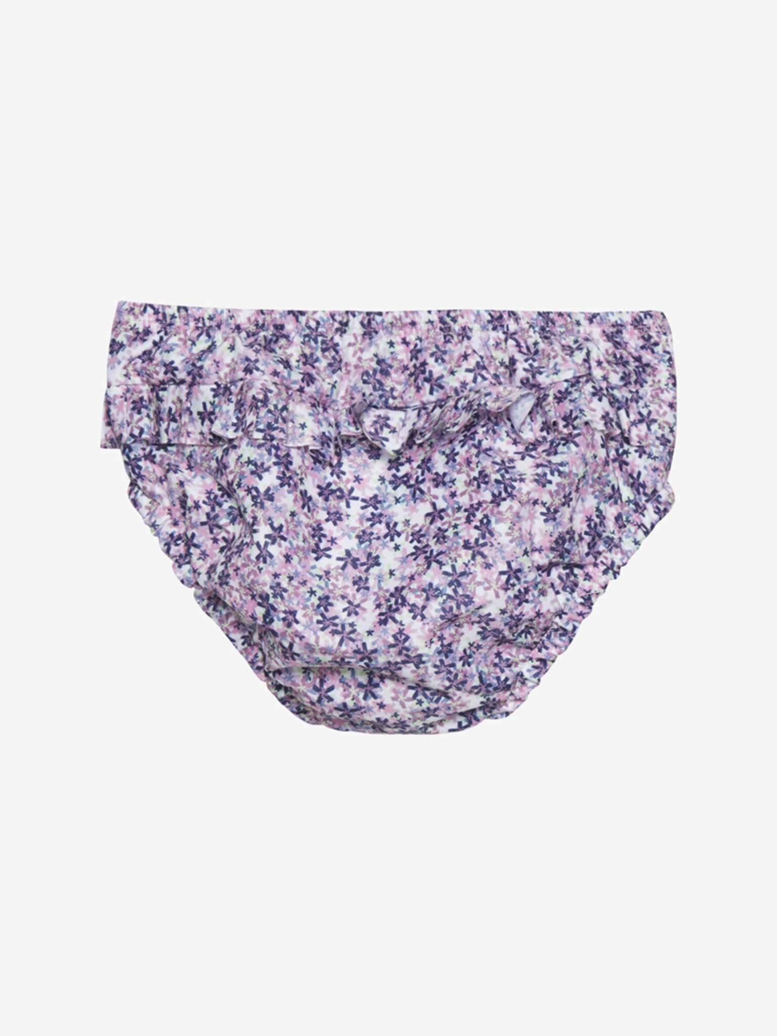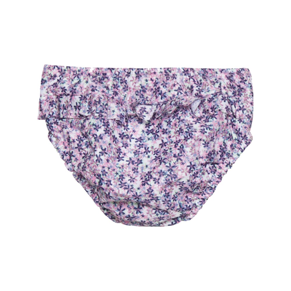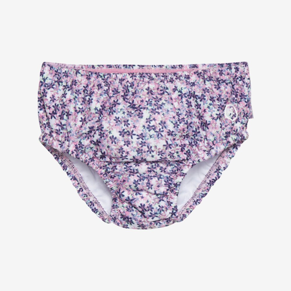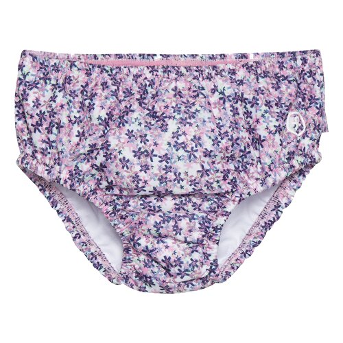 Roztomile plienkové plavky s celoplošnou potlačou kvetiniek. Majú gumičku v páse a okolo nožičiek. Vzadu volániky. Logo na boku. Použiteľné namiesto plienok do vody. Dajú sa oprať.